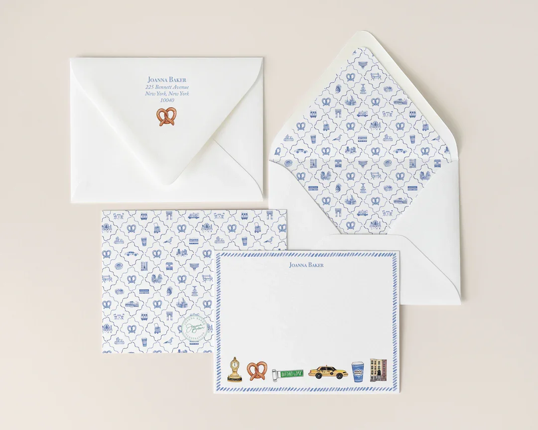 A charming set of personalized notecards featuring hand-illustrated NYC favorites — the perfect way to add a little city magic to every message.